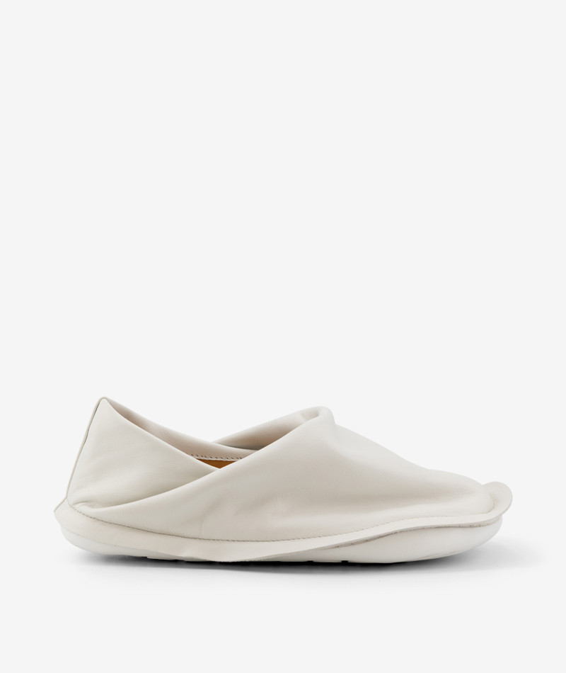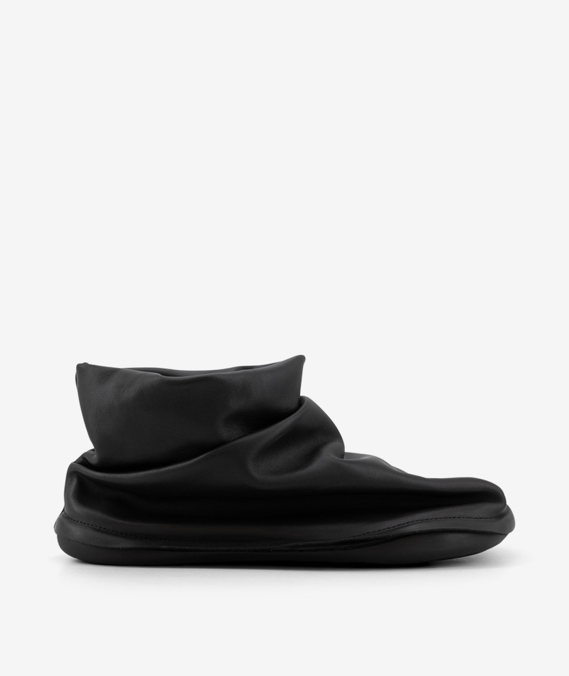 The method is based on the idea of creating garments and three-dimensional objects from a single piece of fabric (or material), minimizing waste, seams, and rigidity. In the Peu Form capsule, this concept takes shape through Italian leather shoes with a fluid structure, lightweight feel, and no visible stitching. Objects that don’t just dress the body — they engage in dialogue with it and the space around it.
