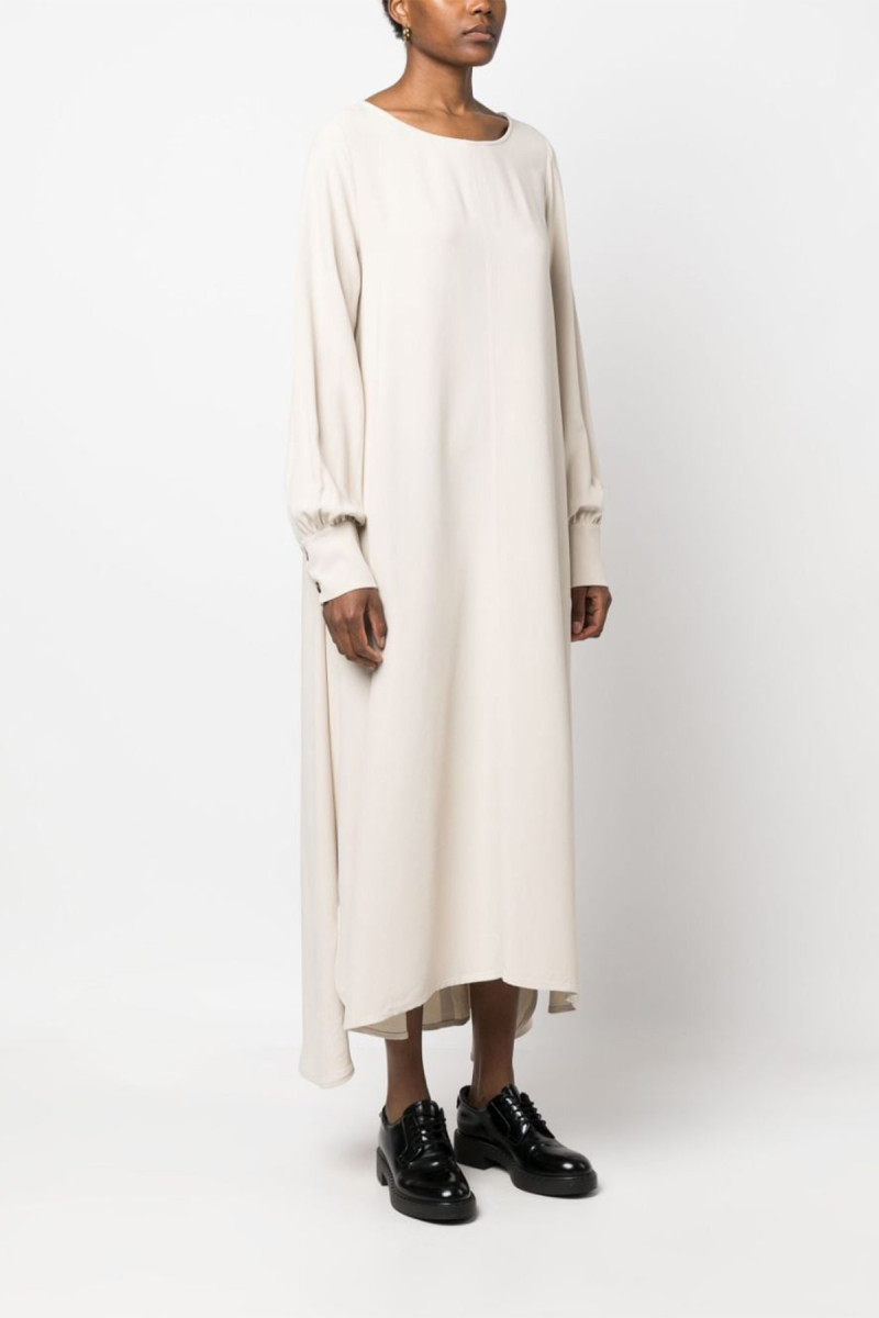 Rue Chapon dress from the brand Société Anonyme Créations. Made near Florence, the cream-colored dress has long sleeves with cuffs and buttons, and a round neckline. Made of 100 percent viscose, the dress is one-tone with tonal waistband detail. The length is at the ankles, on the dress two small side slits, the hem is flared longer in the back.